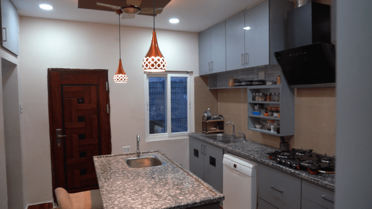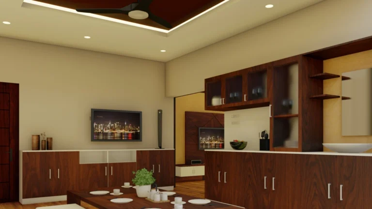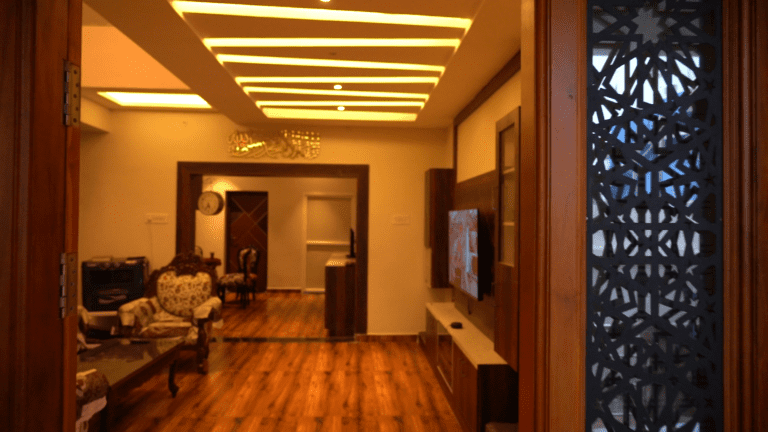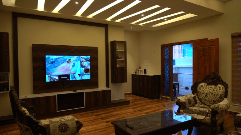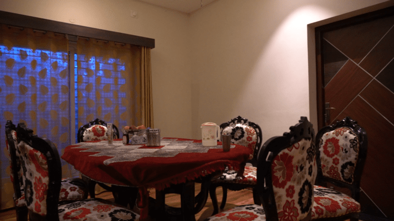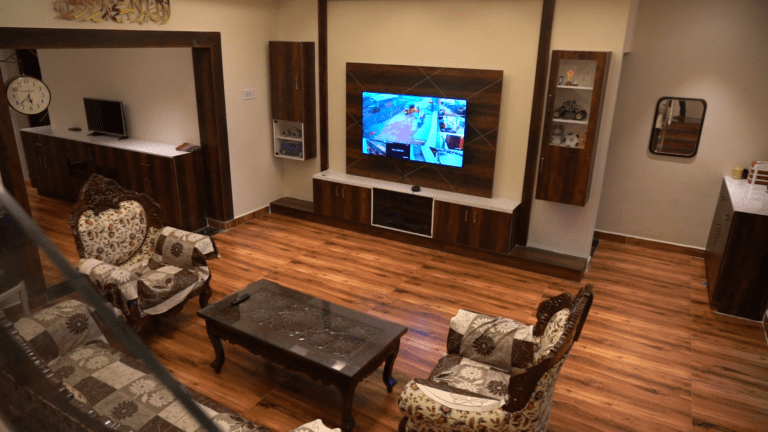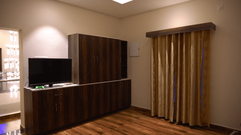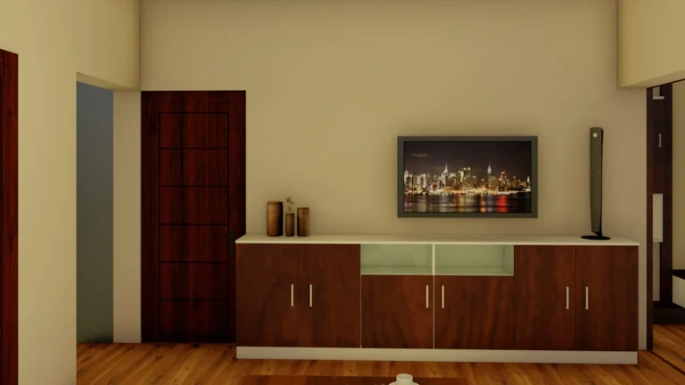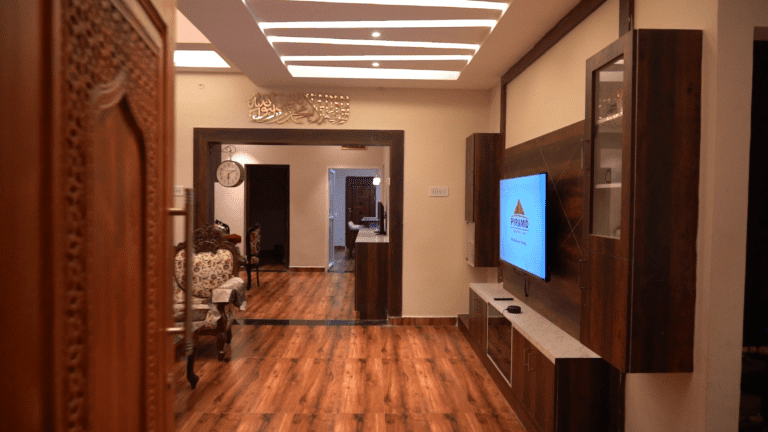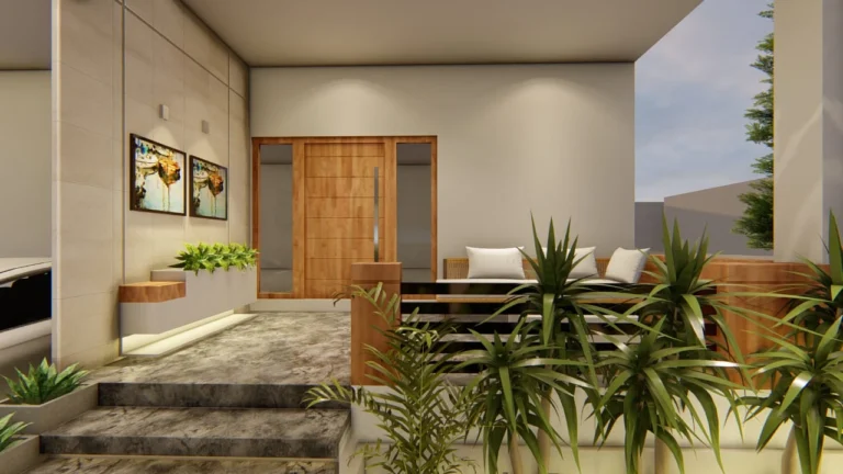 The entrance boasts a warm and inviting atmosphere, perfect for making a lasting first impression. Large, imposing doors swing open to reveal a spacious foyer area, elegantly designed for relaxation and comfort. A beautifully crafted shoe rack, blending functionality with aesthetic appeal, provides ample storage for footwear. The thoughtfully designed seating area invites guests to linger, relax, and unwind, setting the tone for a pleasant experience within