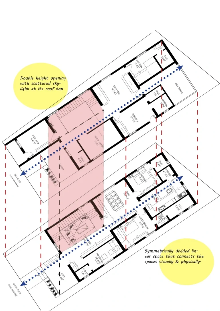 Oriented east-west, the building’s design takes full advantage of natural light, with its longer sides facing north and south. This linear layout allows for a seamless progression from the beach-side entrance on the south to the kitchen, creating a sense of fluidity and connection. The entrance foyer is marked by a striking, cantilevered slab, crafting an intimate and inviting atmosphere. As you move through the space, the waiting lounge gives way to a spacious living area, where a double-height ceiling and strategically placed rooftop openings bring in a flood of natural light. A sleek staircase on the west side of the hall leads to the upper floor, home to a kids’ bedroom and indoor theater. Throughout, carefully positioned skylights weave together the upper and ground floors, bathing the space in soft, diffused light and elevating the overall experience.”