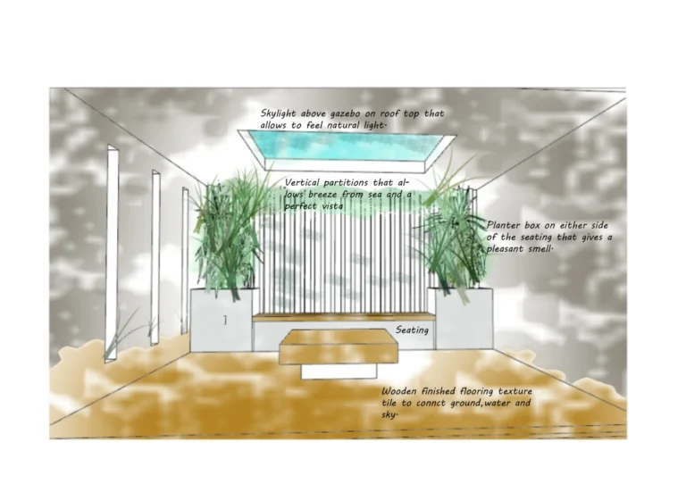 The gazebo’s innovative design combines functionality and breathtaking views. The roof slab features strategically placed punctures, allowing natural light to filter in and create a warm ambiance. Below, comfortable seating areas are shaded by a solid ceiling, providing respite from the sun. The gazebo’s partial vertical opening, framing stunning sea-side vistas and inviting the ocean breeze to gently sweep through.