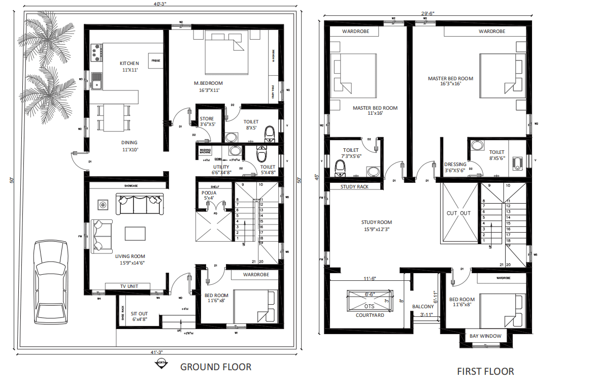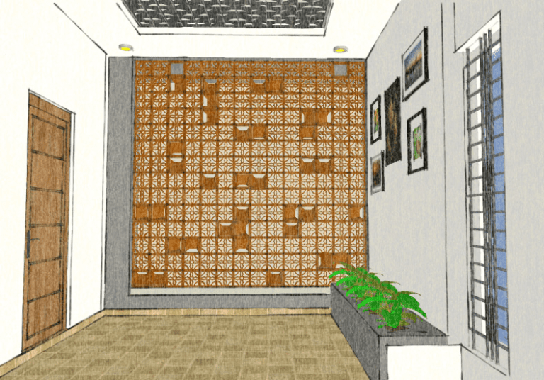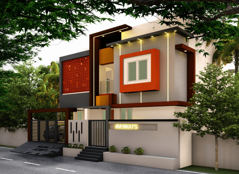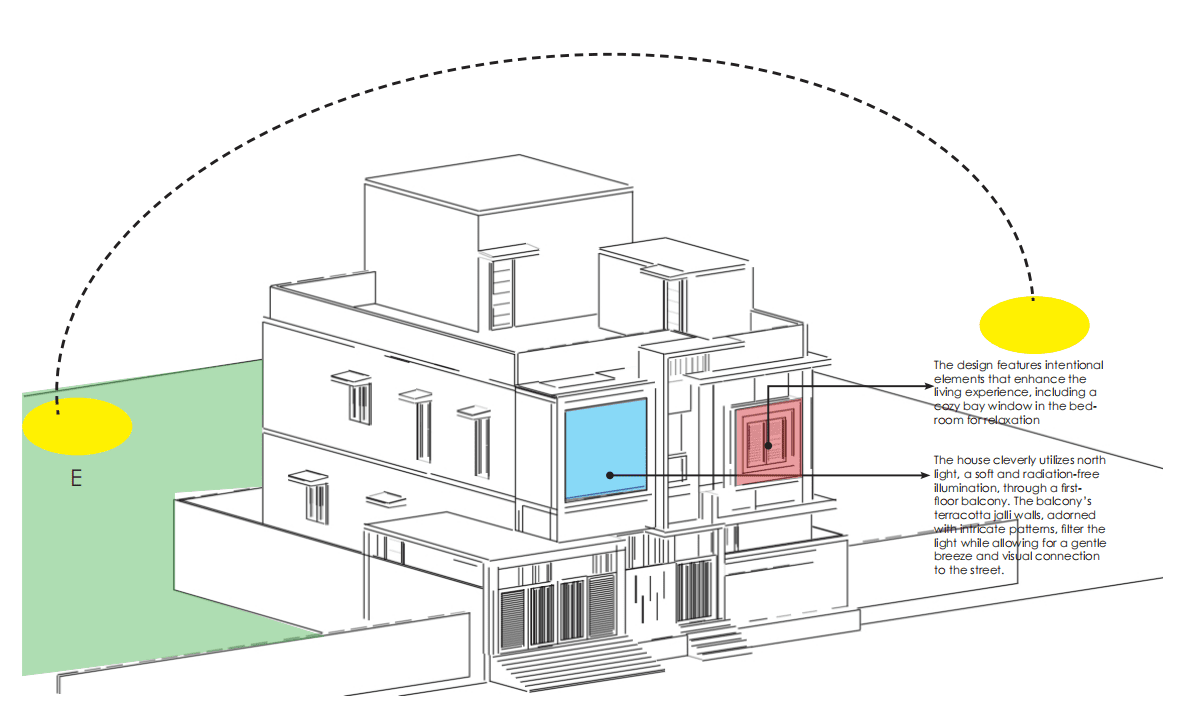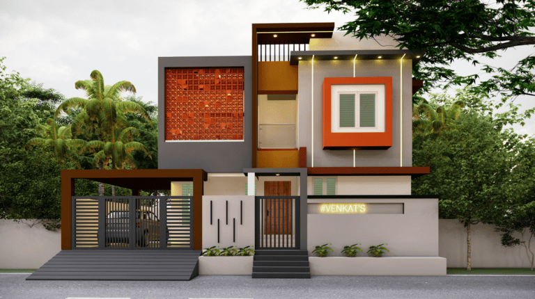 Nestled in the suburban area of Madurai, the Venkat Residence boasts a thoughtful design that harnesses the power of natural light and ventilation. Situated on a 42ft x 50ft site with its shorter side facing north, the house cleverly utilizes north light, a soft and radiation free illumination, through a first-floor balcony. The balcony’s terracotta jalli walls, adorned with intricate patterns, filter the light while allowing for a gentle breeze and visual connection to the street.